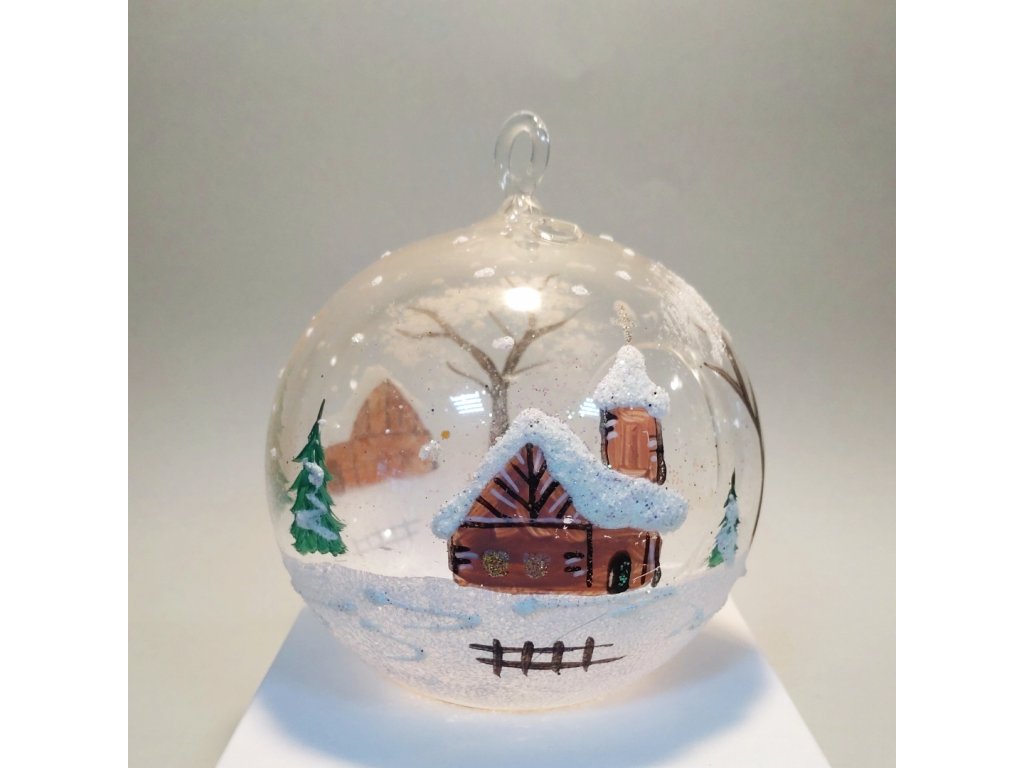 Ručně malovaná koule ze simaxového skla s otvorem na čajovou svíčku. Skleněná ozdoba s jemnou malbou zasněžené krajiny s kostelíkem vykouzlí tu správnou vánoční atmosféru.