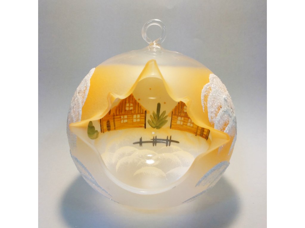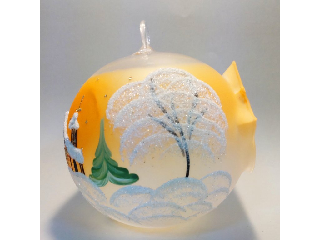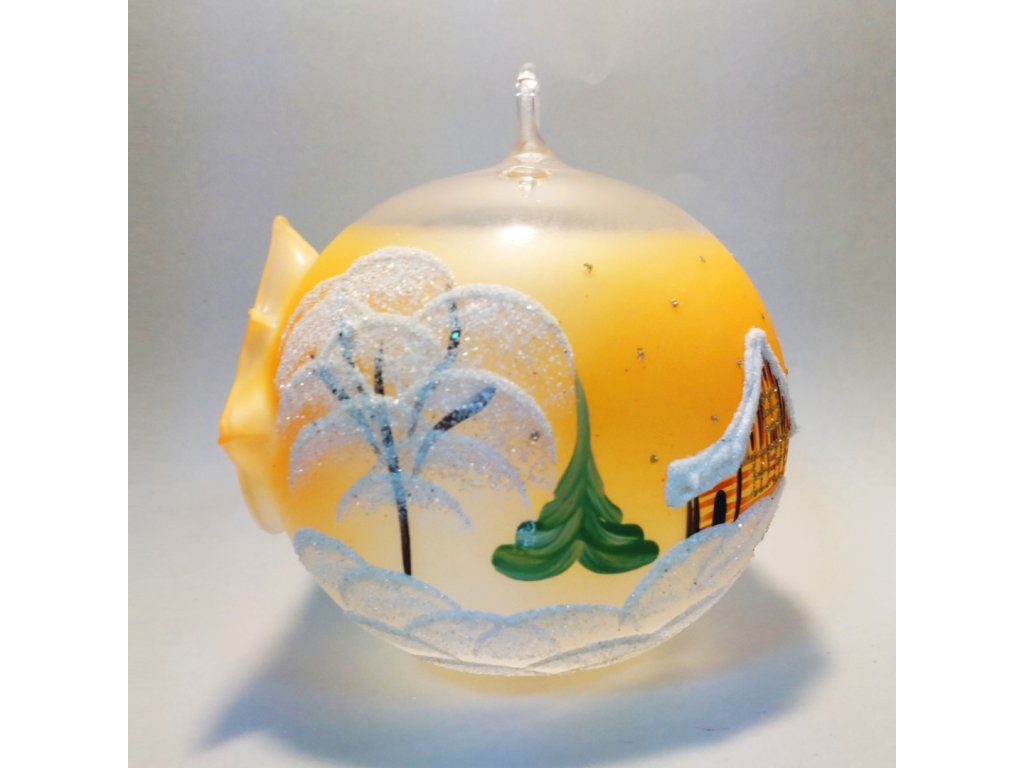 Ručně malovaná koule ze simaxového skla v oranžovém provedení s otvorem na čajovou svíčku. Skleněná ozdoba s jemnou malbou zasněžené krajiny s kostelíkem vykouzlí tu správnou vánoční atmosféru.