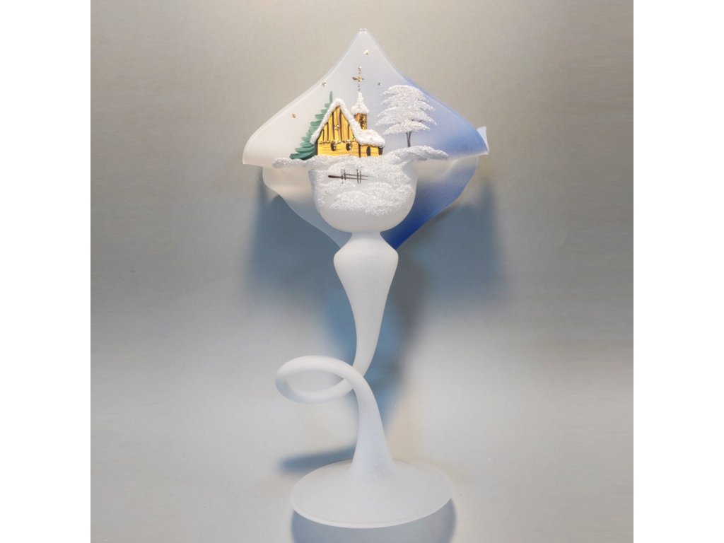 Ručně malovaný svícen ze simaxového skla v modrém provedení. Skleněný svícen s jemnou malbou zasněžené krajiny s kostelíkem vykouzlí tu správnou vánoční atmosféru.