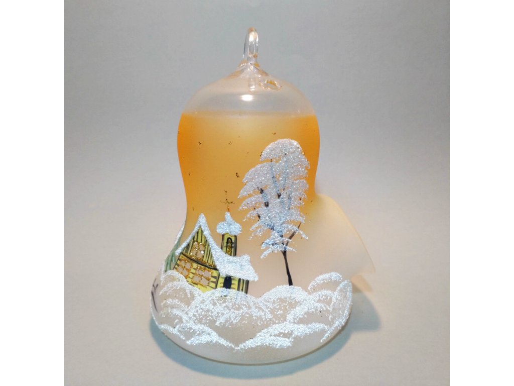 Ručně malovaný zvonek ze simaxového skla v oranžovém provedení s otvorem na čajovou svíčku. Skleněná ozdoba s jemnou malbou zasněžené krajiny s kostelíkem vykouzlí tu správnou vánoční atmosféru.