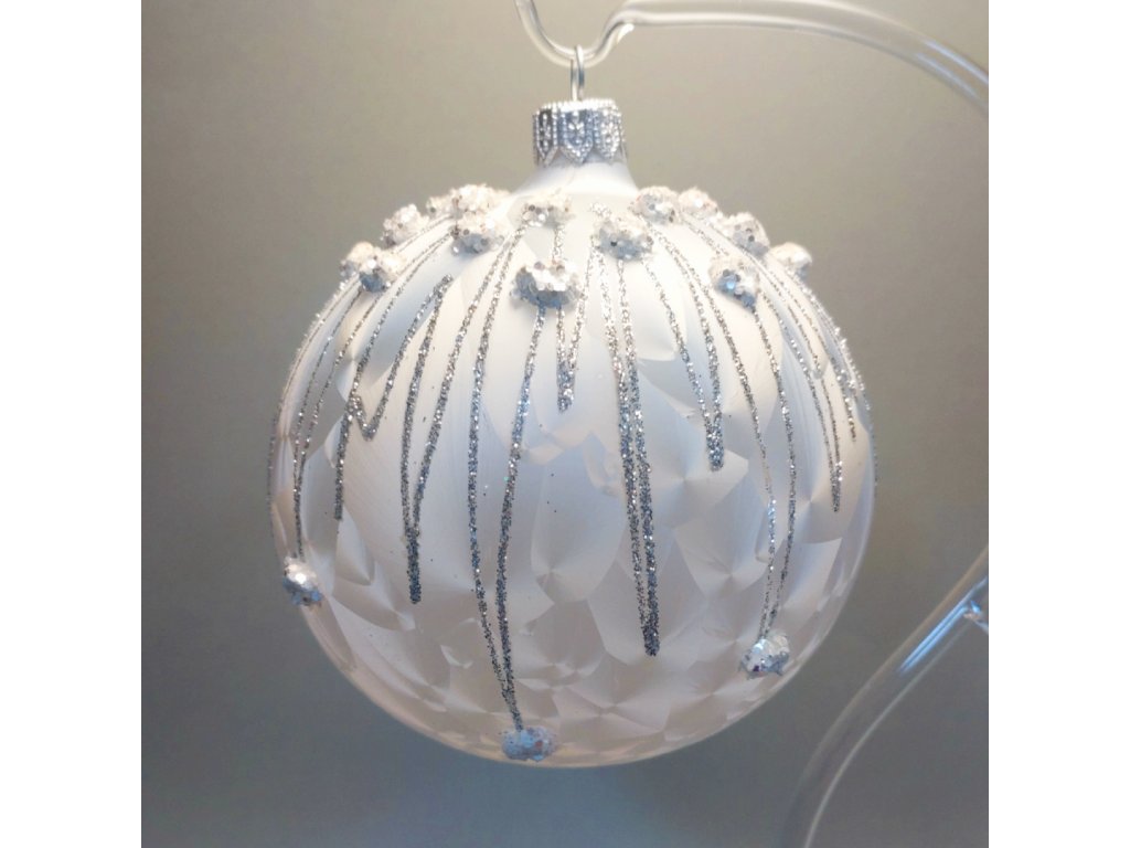 Ručně vyráběná skleněná ozdoba ve tvaru koule v bílém provedení. Díky malovanému stříbrnému dekoru, s použitím bílých kouliček, se tato ozdoba stane výjimečným prvkem na Vašem vánočním stromku.