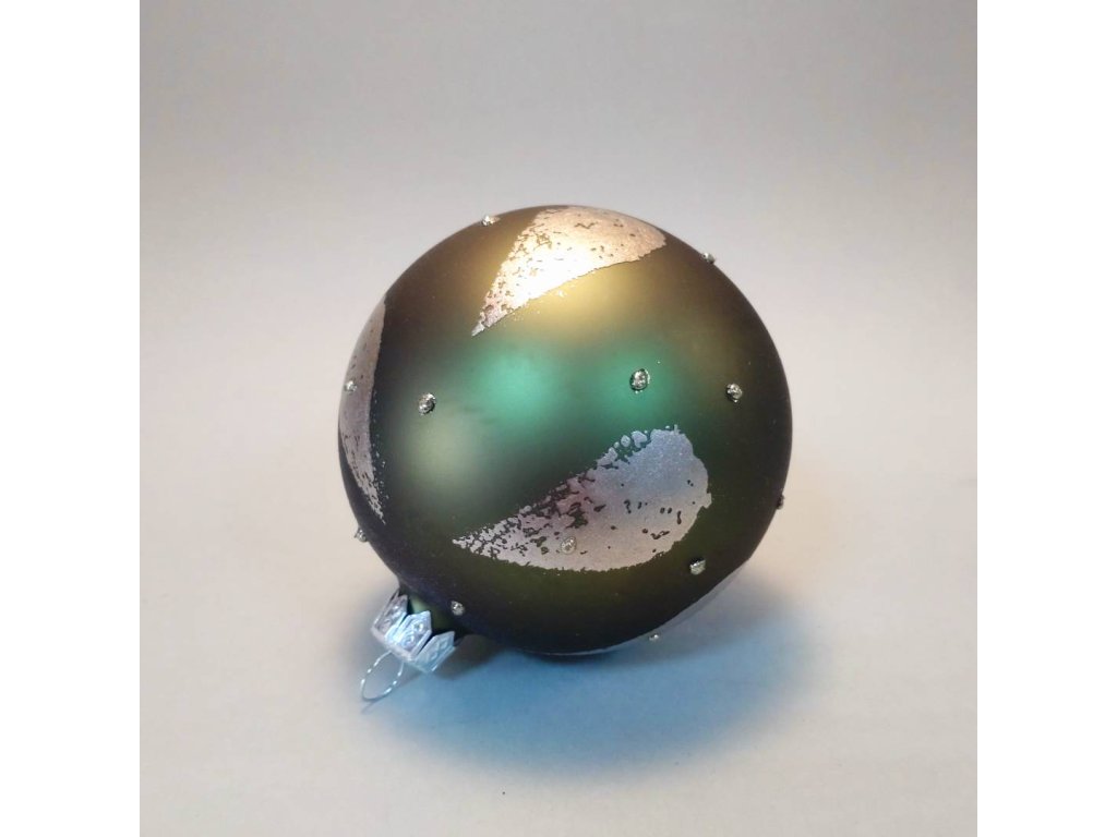 Ručně vyráběná skleněná ozdoba ve tvaru koule v matném zeleném provedení. Díky malovanému stříbrnému dekoru se tato ozdoba stane výjimečným prvkem na Vašem vánočním stromku.