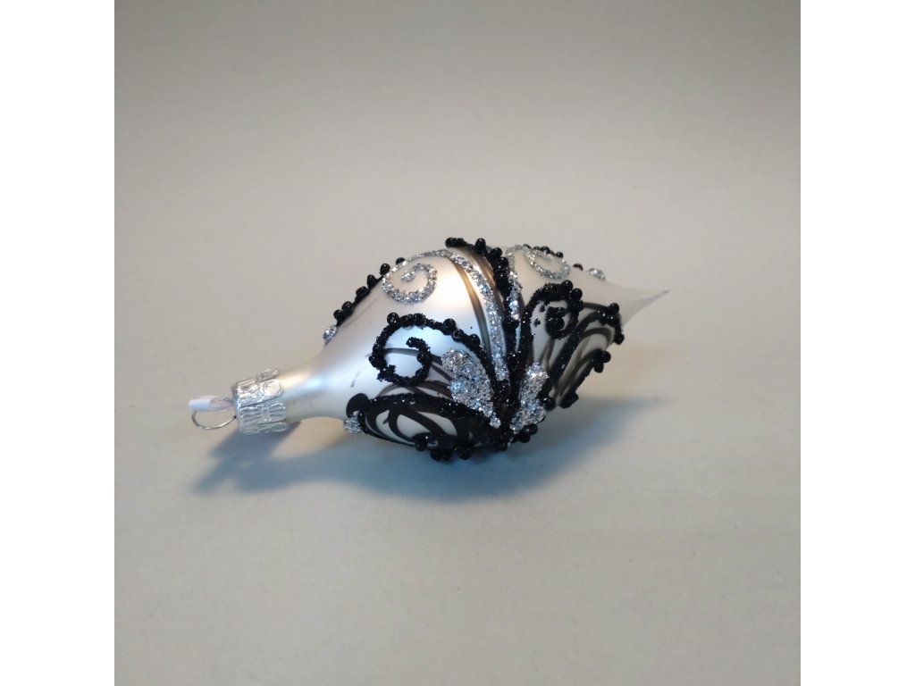 Ručně vyráběná skleněná ozdoba ve tvaru olivy v matném bílém provedení. Díky malovanému stříbrno-černému dekoru, s použitím černých korálků, se tato ozdoba stane výjimečným prvkem na Vašem vánočním stromku.