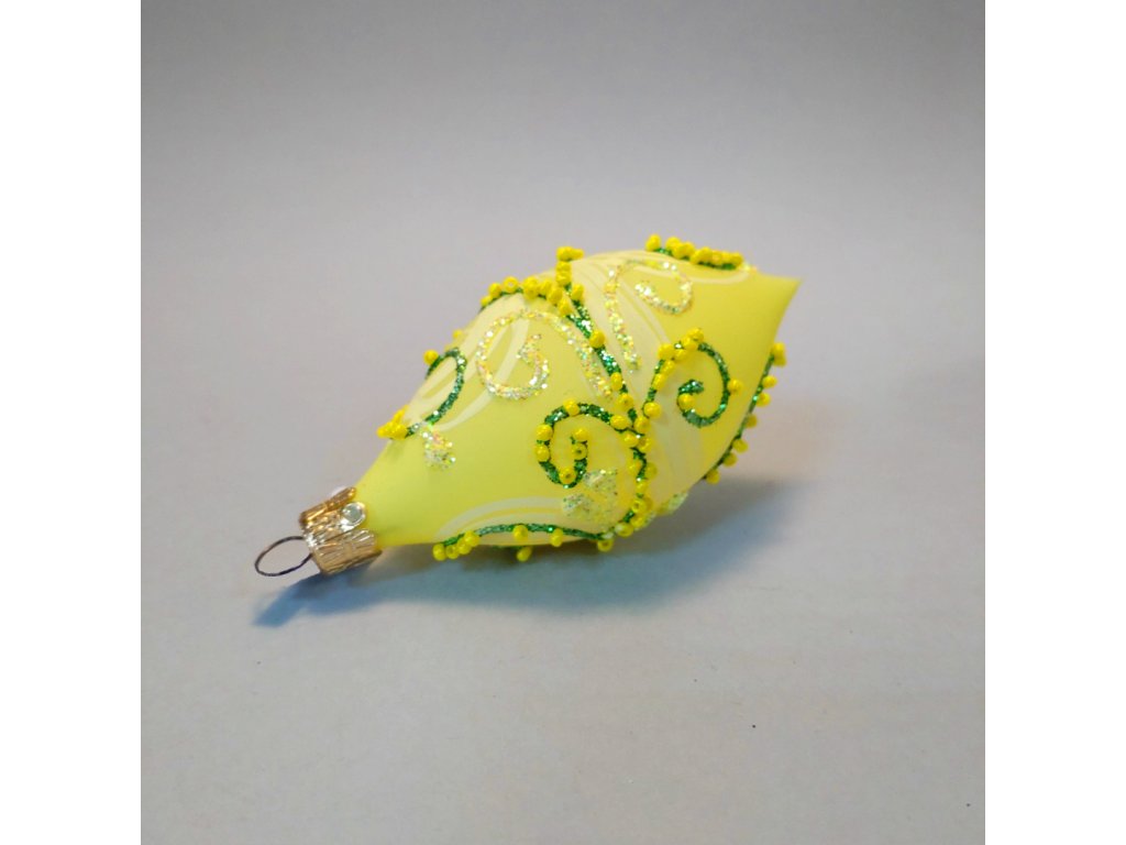 Ručně vyráběná skleněná ozdoba ve tvaru olivy v matném žlutém provedení. Díky malovanému žluto-zelenému dekoru, s použitím žlutých korálků, se tato ozdoba stane výjimečným prvkem na Vašem vánočním stromku.