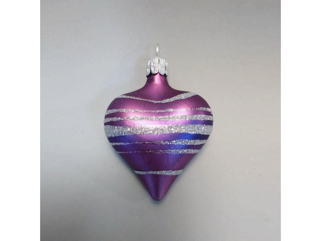 Ručně vyráběná skleněná ozdoba ve tvaru srdce v matném fialovém provedení. Díky malovanému stříbrnému dekoru se tato ozdoba stane vhodným doplňkem Vašeho vánočního stromku.