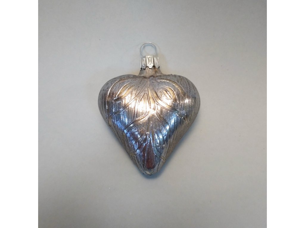 Ručně vyráběná skleněná ozdoba ve tvaru srdce ve stříbrném provedení. Díky plastickému dekoru se tato ozdoba stane výjimečným prvkem na Vašem vánočním stromku.
