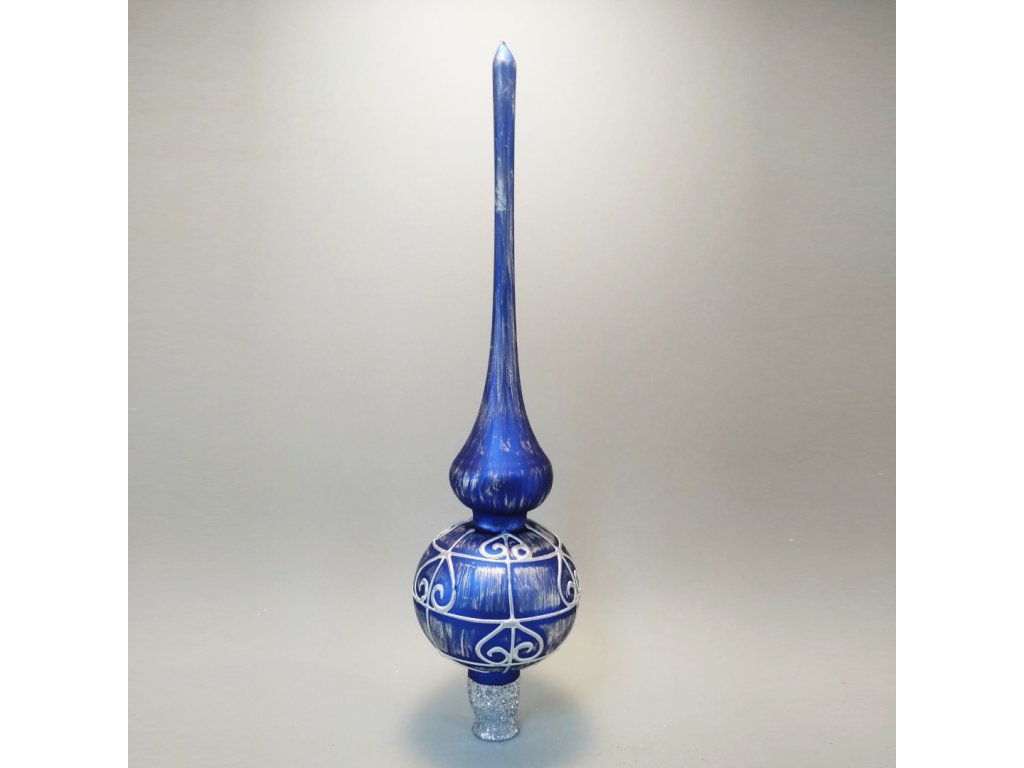 Ručně vyráběná skleněná špice na vánoční stromek v matném modrém provedení. Díky malovanému stříbrnému dekoru se tato ozdoba stane důležitým a výjimečným prvkem na Vašem vánočním stromku.