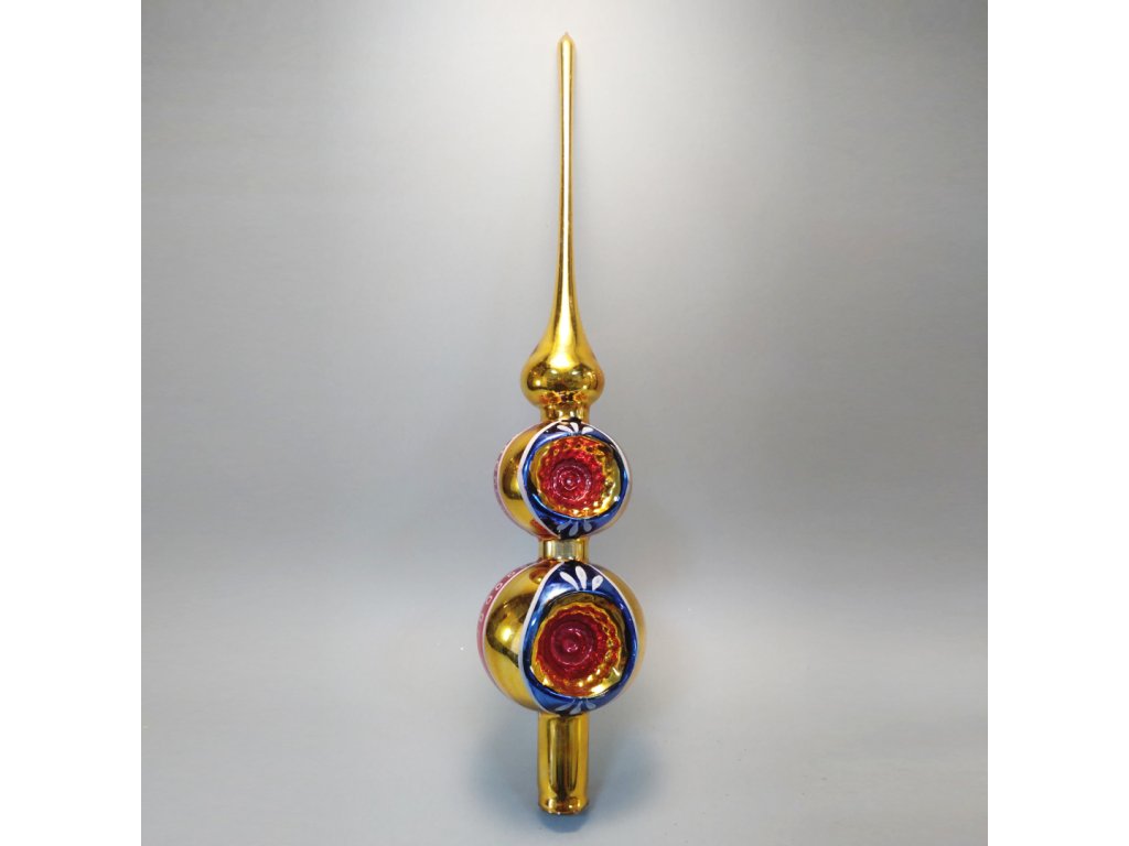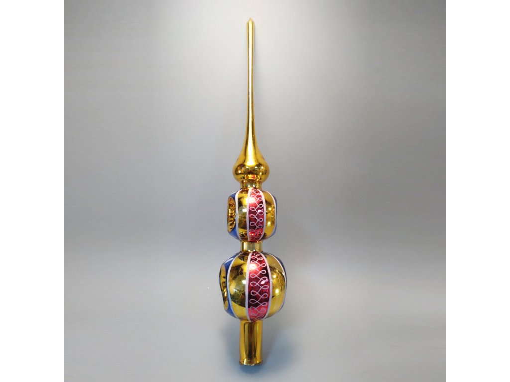Ručně vyráběná skleněná špice na vánoční stromek. Retro vzhled v lesklém zlatém provedení s malovaným modro-červeným dekorem. Právě díky svému vzhledu se tato ozdoba jistě stane výjimečným prvkem na Vašem vánočním stromku.